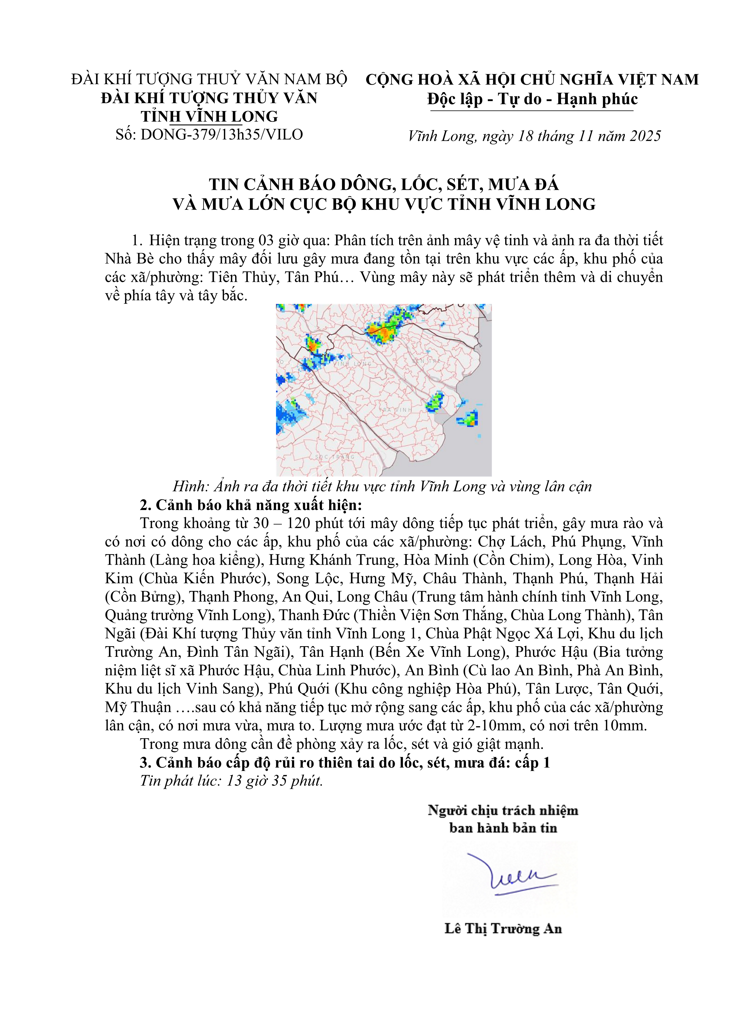 TIN CẢNH BÁO DÔNG, LỐC, SÉT, MƯA ĐÁ VÀ MƯA LỚN CỤC BỘ KHU VỰC TỈNH VĨNH LONG NGÀY 18 THÁNG 11 NĂM 2025