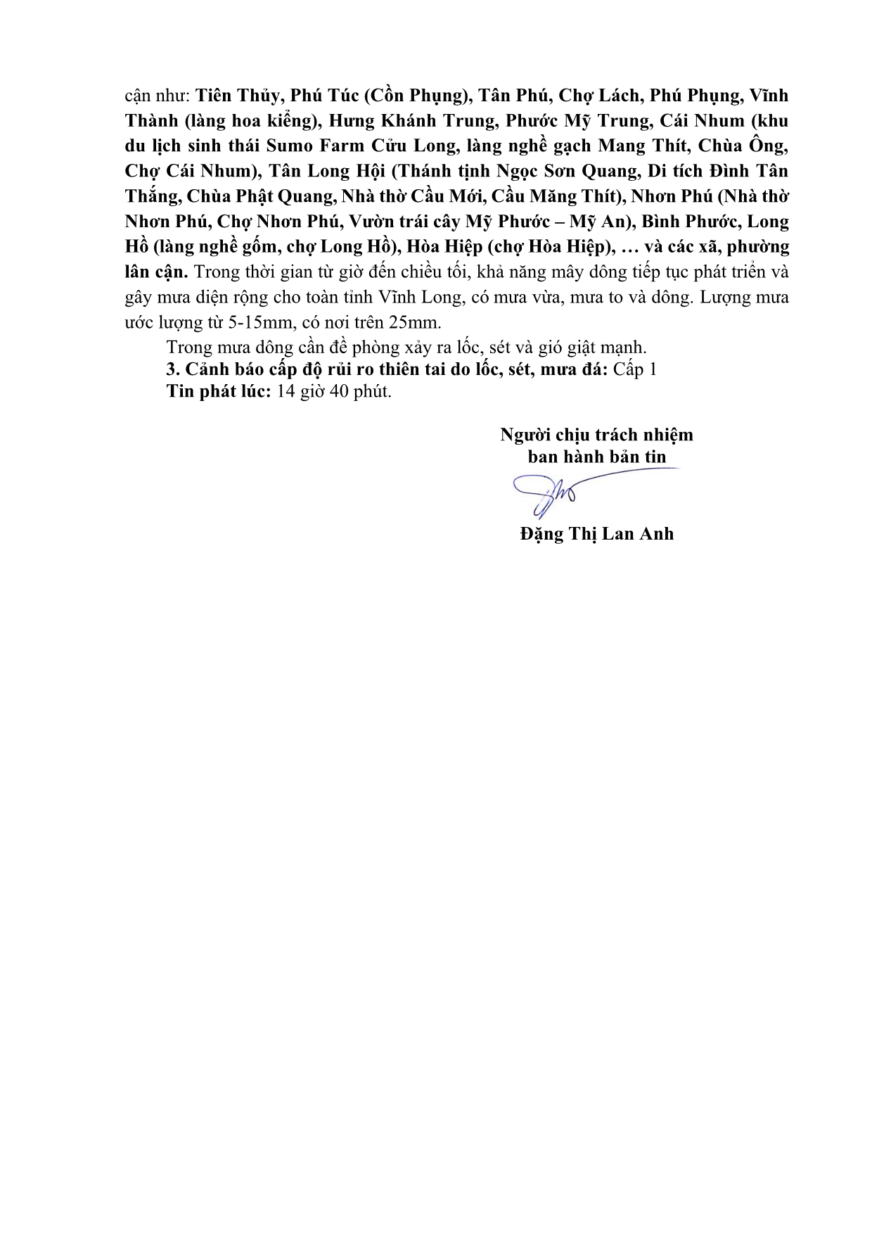 TIN CẢNH BÁO NGẬP LỤT TRÊN KHU VỰC TỈNH VĨNH LONG NGÀY 06 THÁNG 11 NĂM 2025
