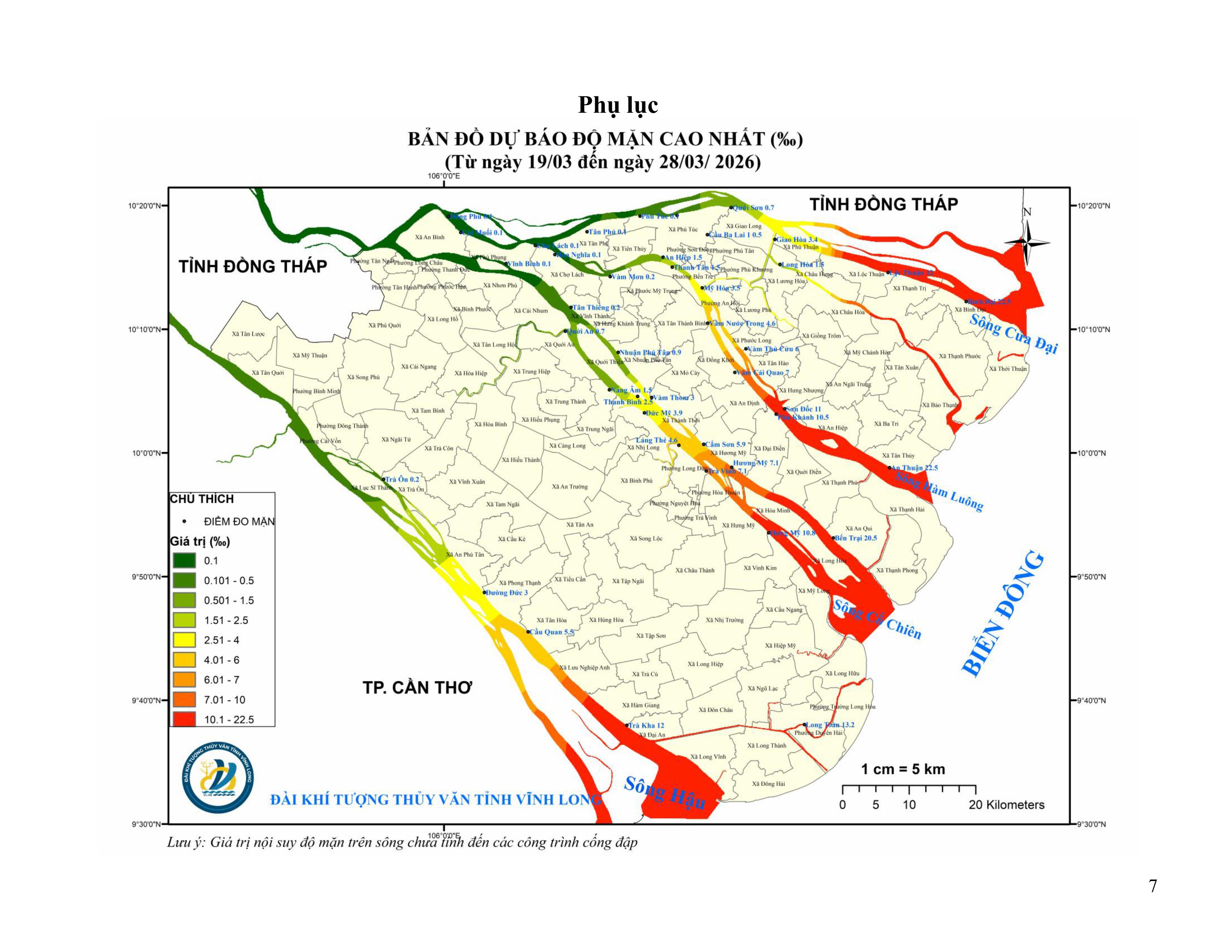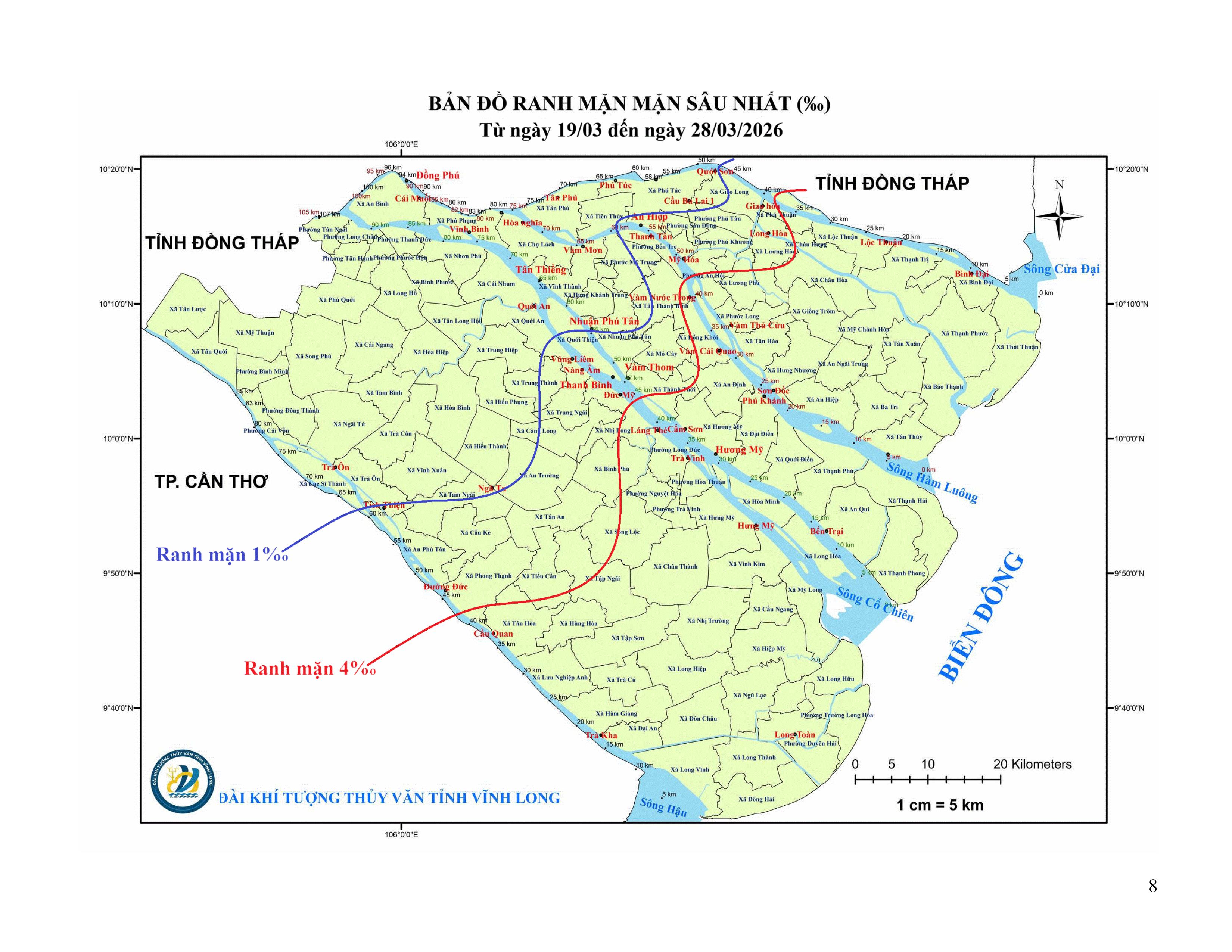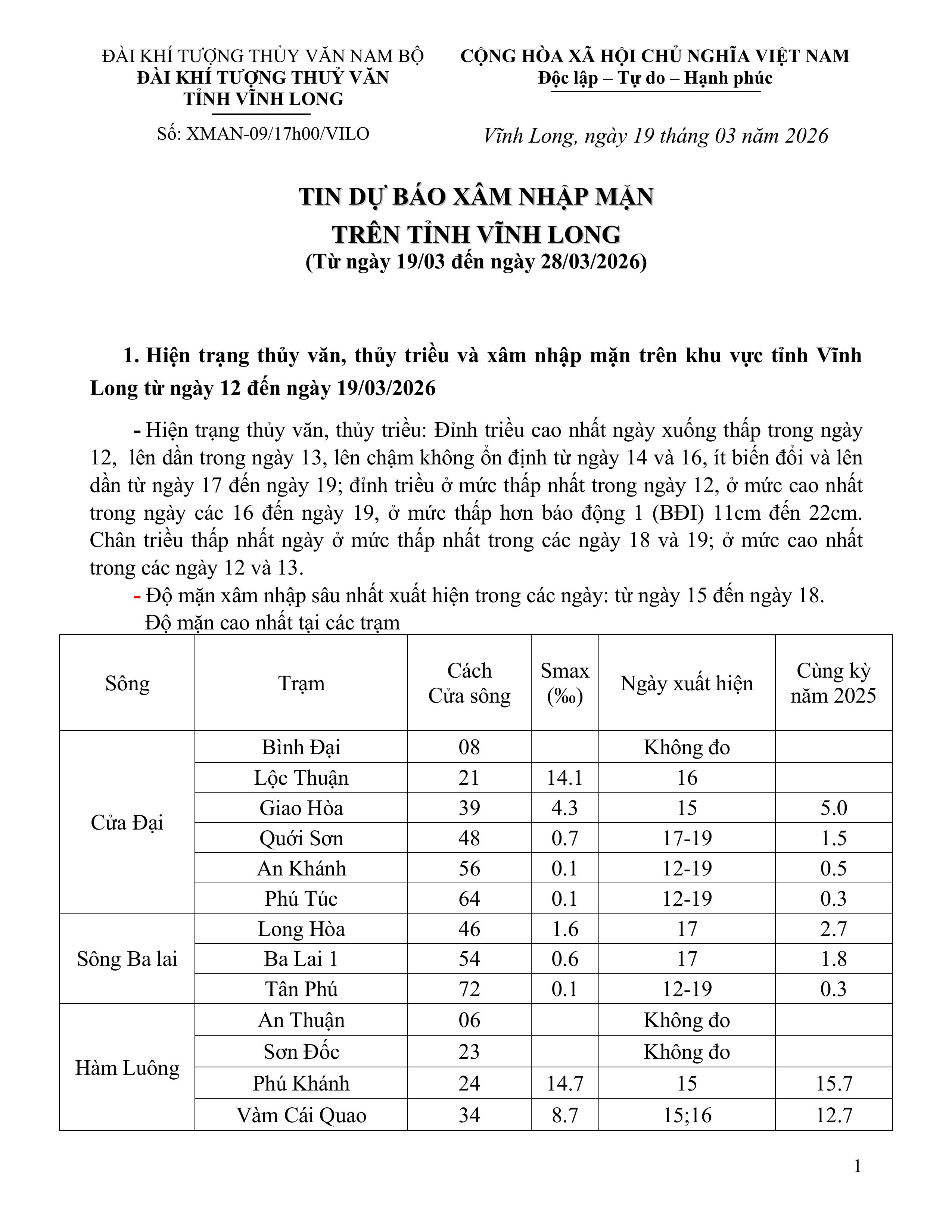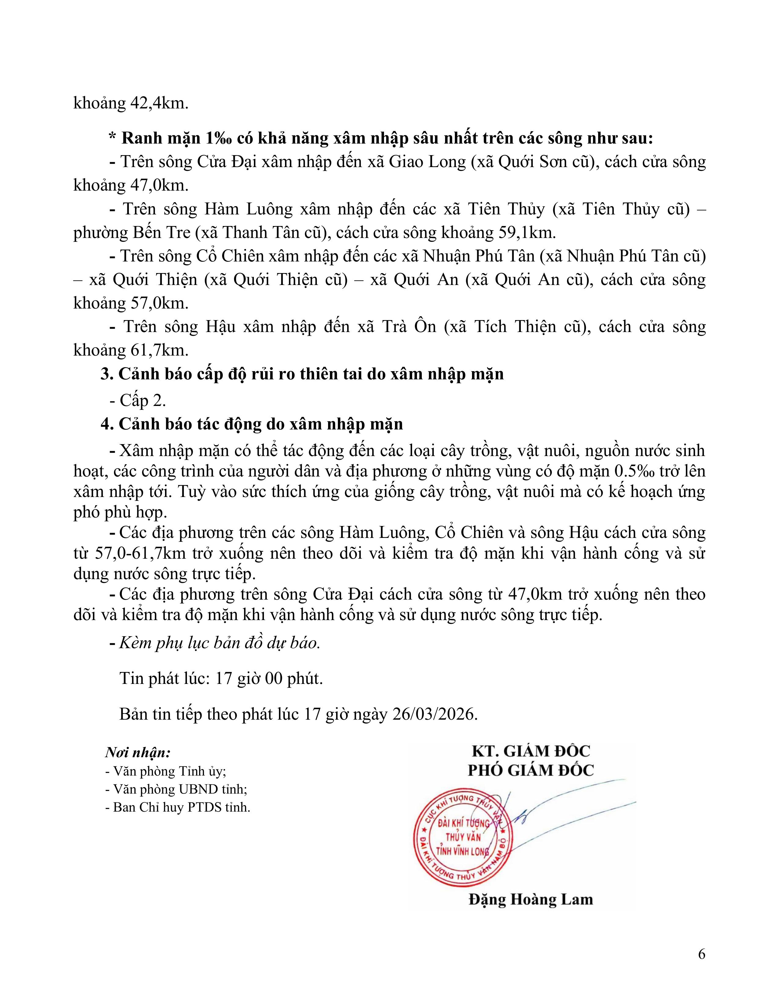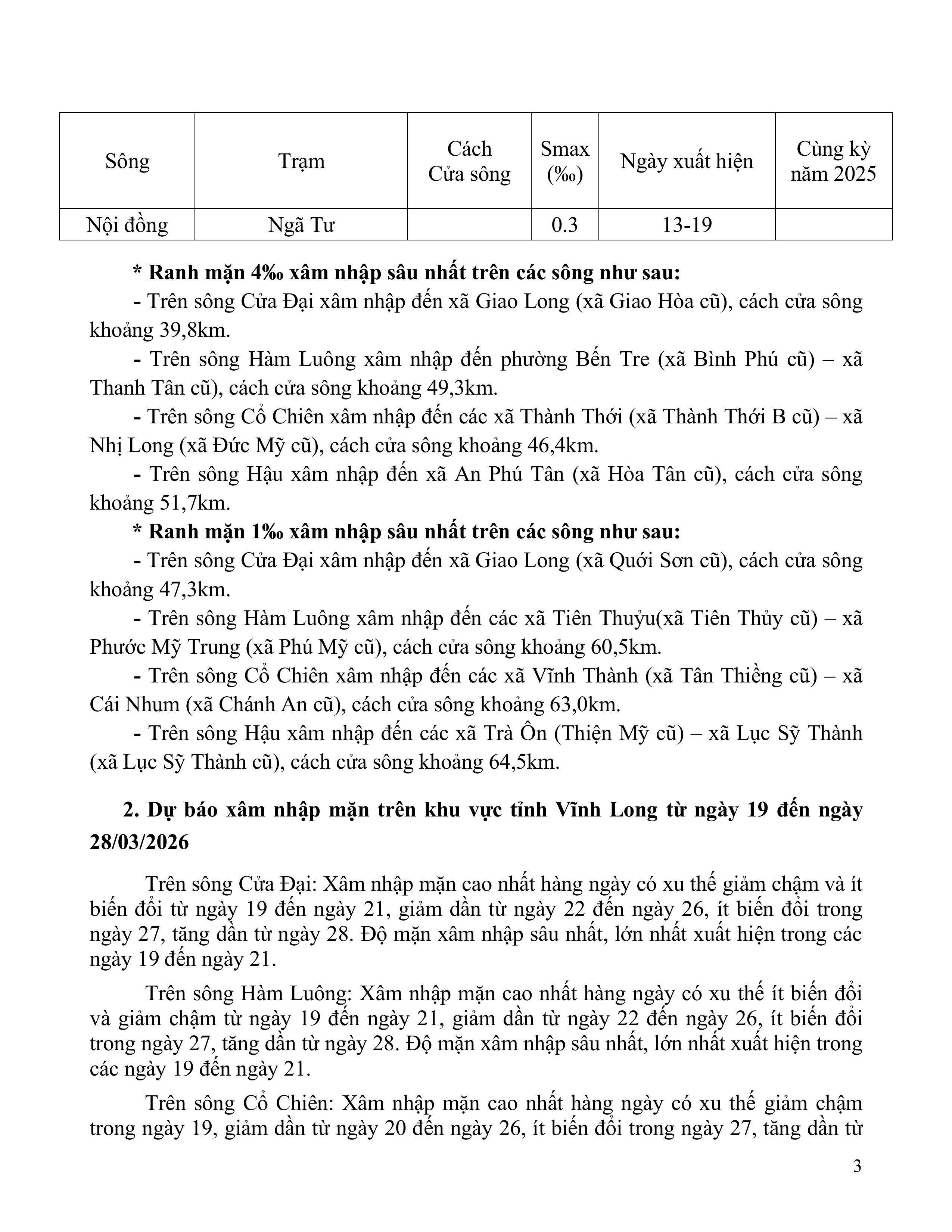 TIN DỰ BÁO XÂM NHẬP MẶN TRÊN TỈNH VĨNH LONG (Từ ngày 19 đến ngày 28/3/2026)