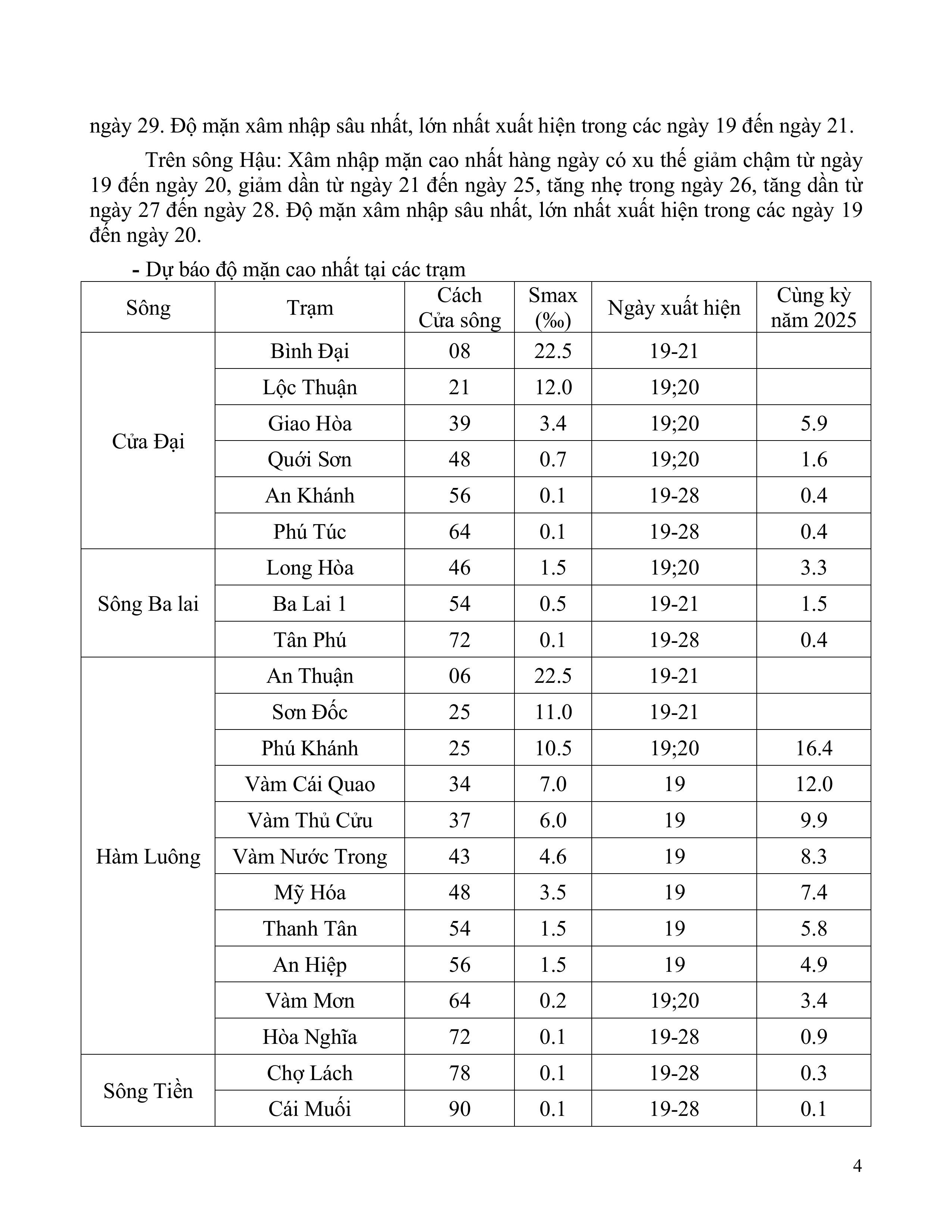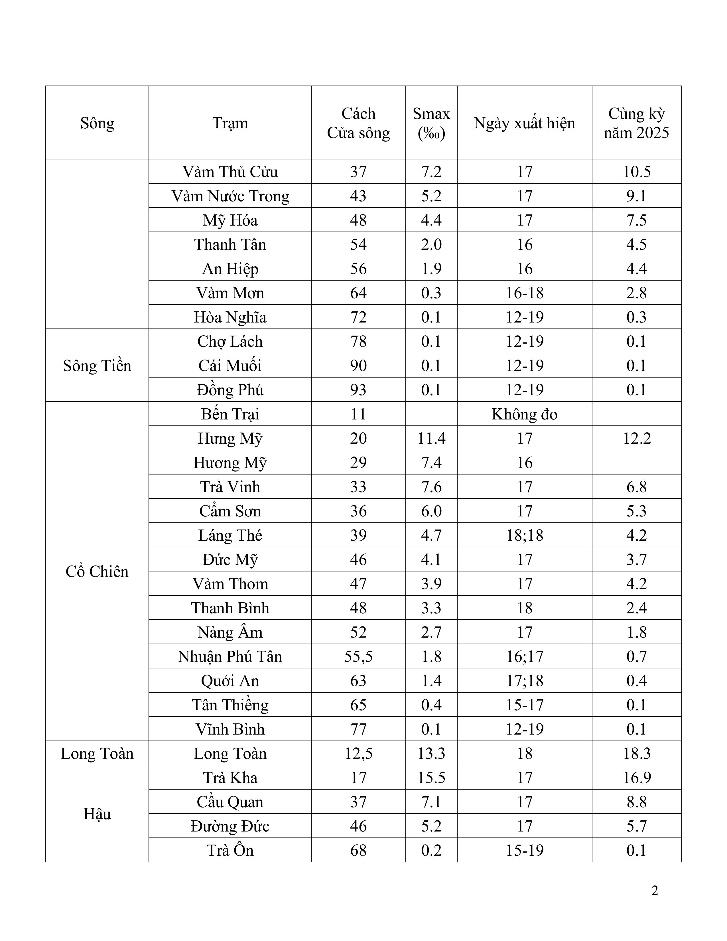 TIN DỰ BÁO XÂM NHẬP MẶN TRÊN TỈNH VĨNH LONG (Từ ngày 19 đến ngày 28/02/2026)