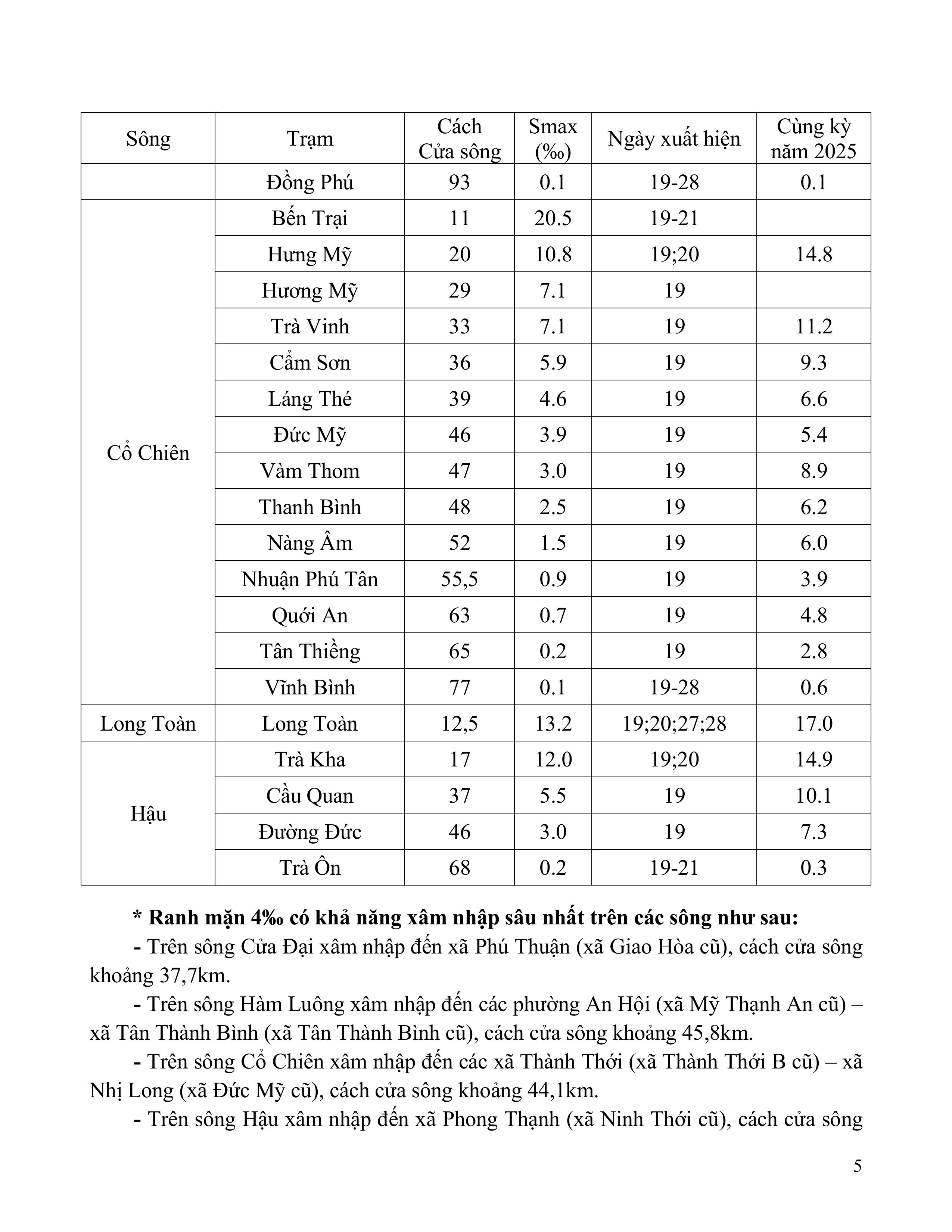 TIN DỰ BÁO XÂM NHẬP MẶN TRÊN TỈNH VĨNH LONG (Từ ngày 05 đến ngày 14/3/2026)